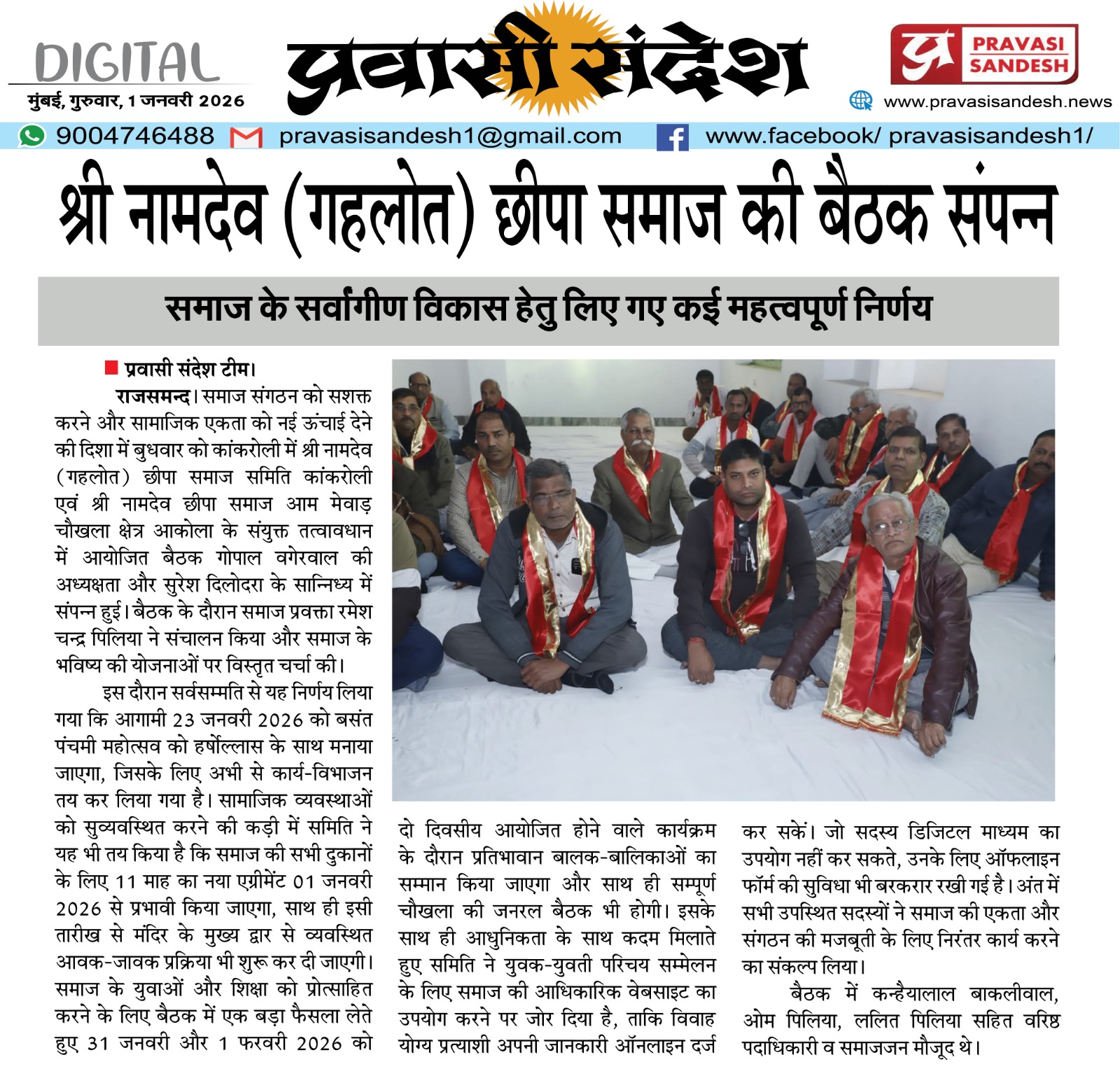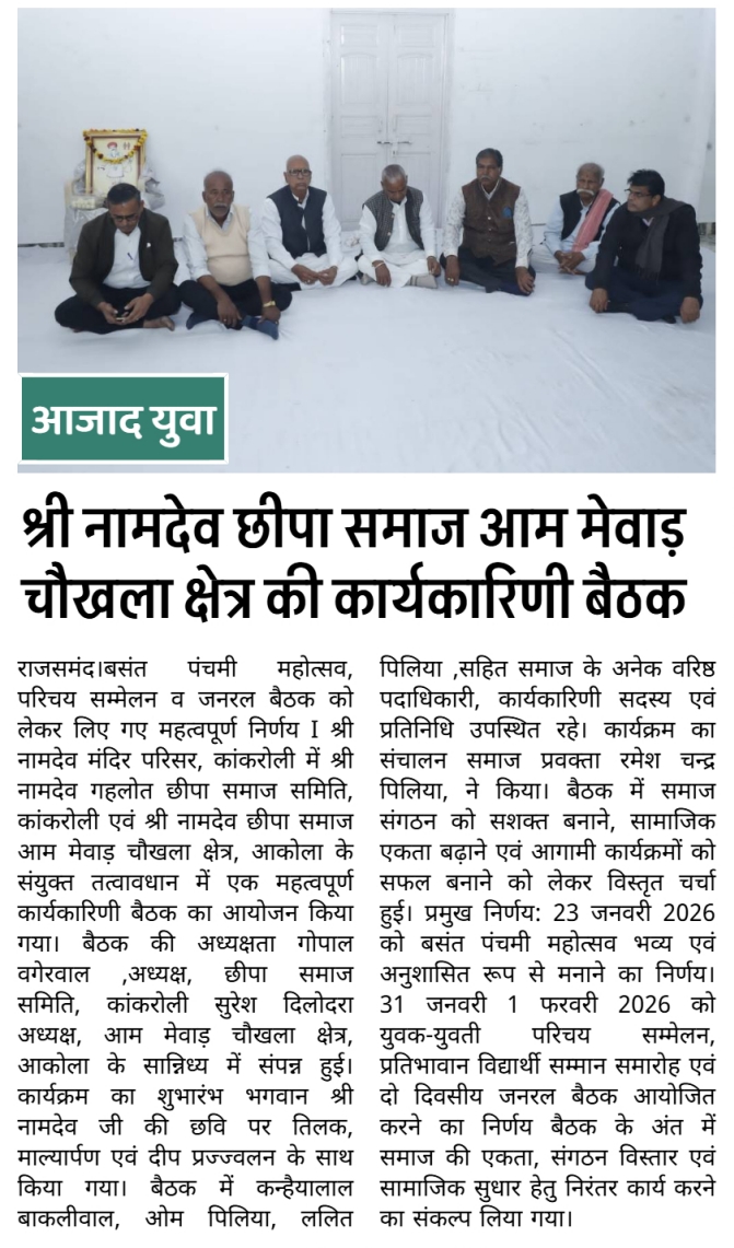 श्री नामदेव (गहलोत) छीपा समाज समिति कांकरोली (आम मेवाड़ चौकला कमेटी क्षेत्र, आकोला)
