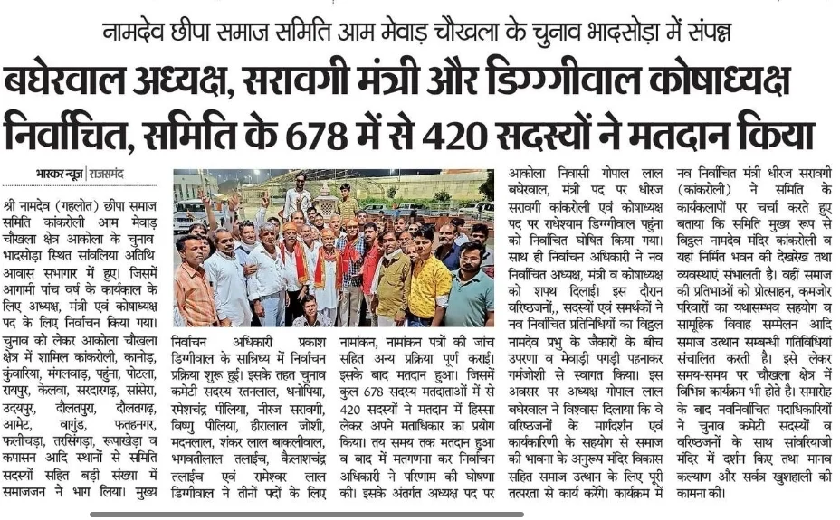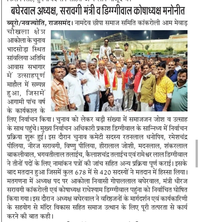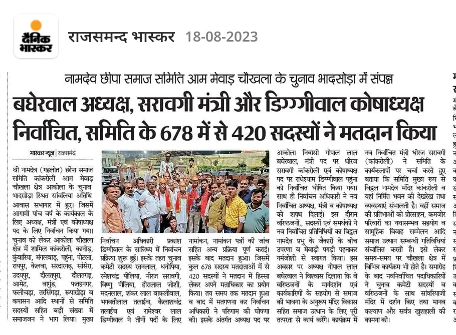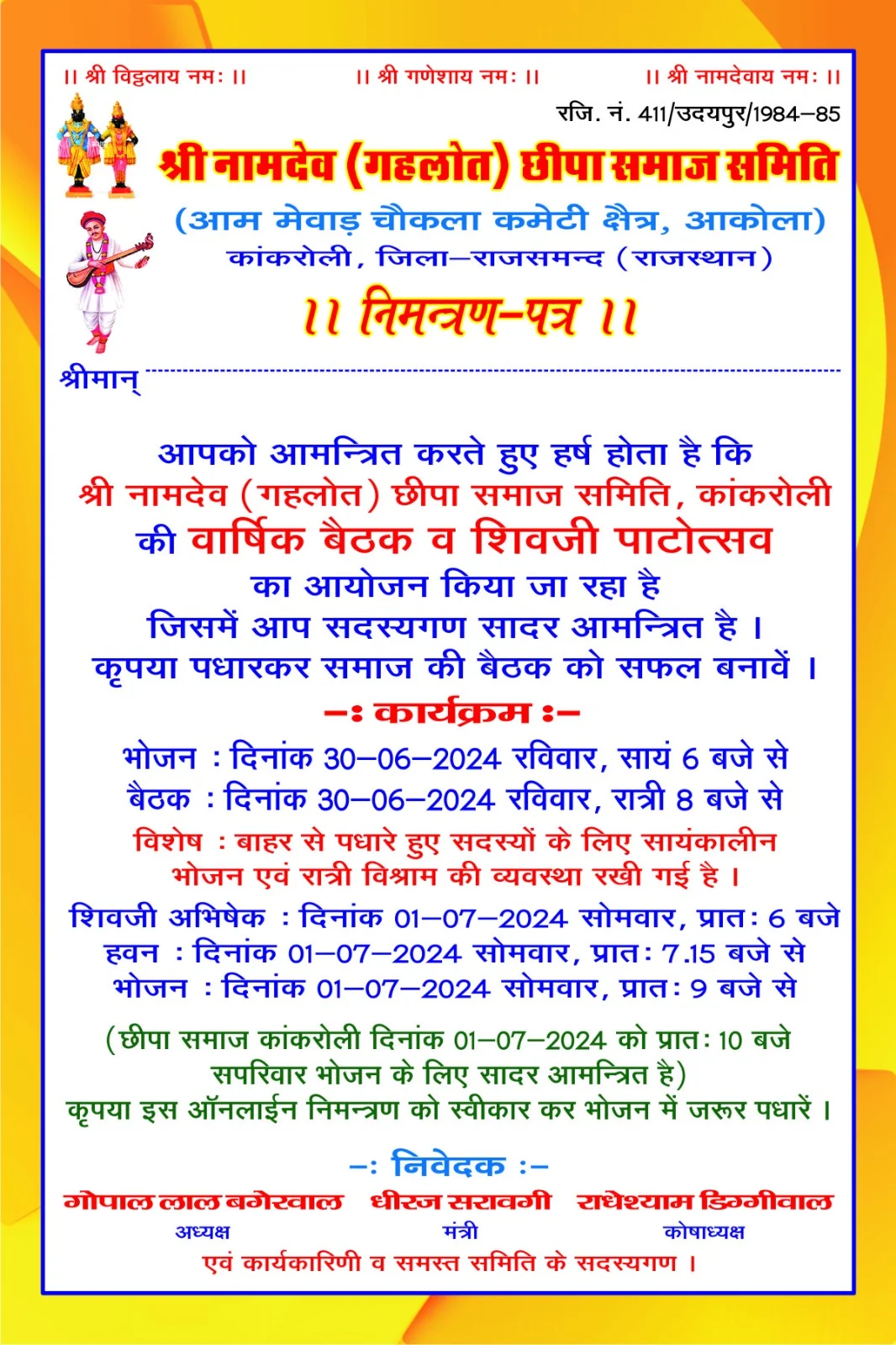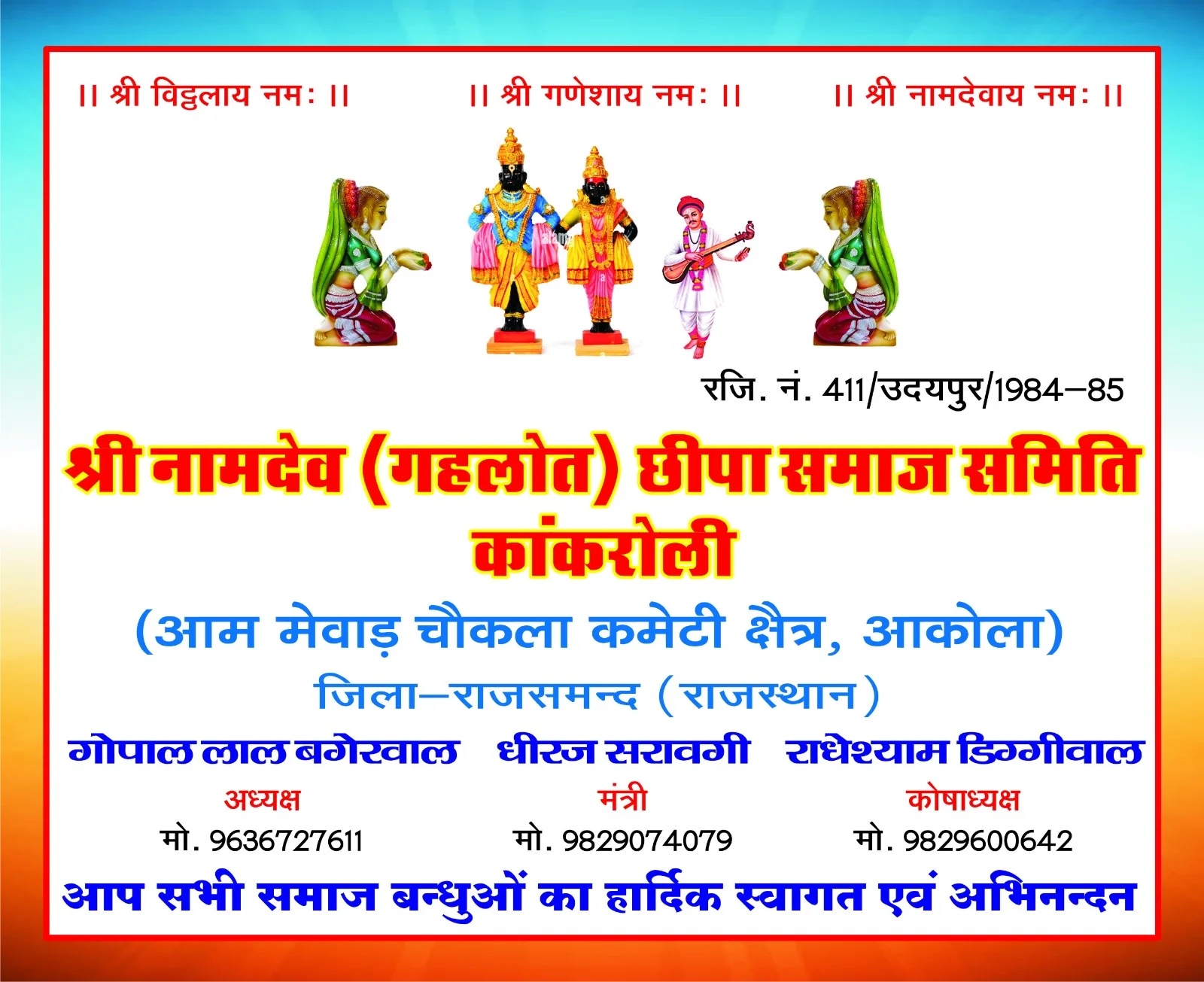 श्री नामदेव (गहलोत) छीपा समाज समिति कांकरोली (आम मेवाड़ चौकला कमेटी क्षेत्र, आकोला)